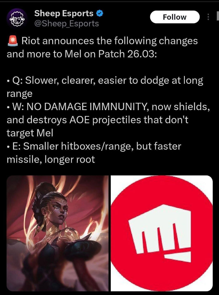 Là một vị tướng mạnh kể từ khi ra mắt đến giờ, Mel chính thức có khả năng bị xóa sổ trong LMHT 26.03 khi Riot Games loại bỏ nhiều cơ chế trong kỹ năng.