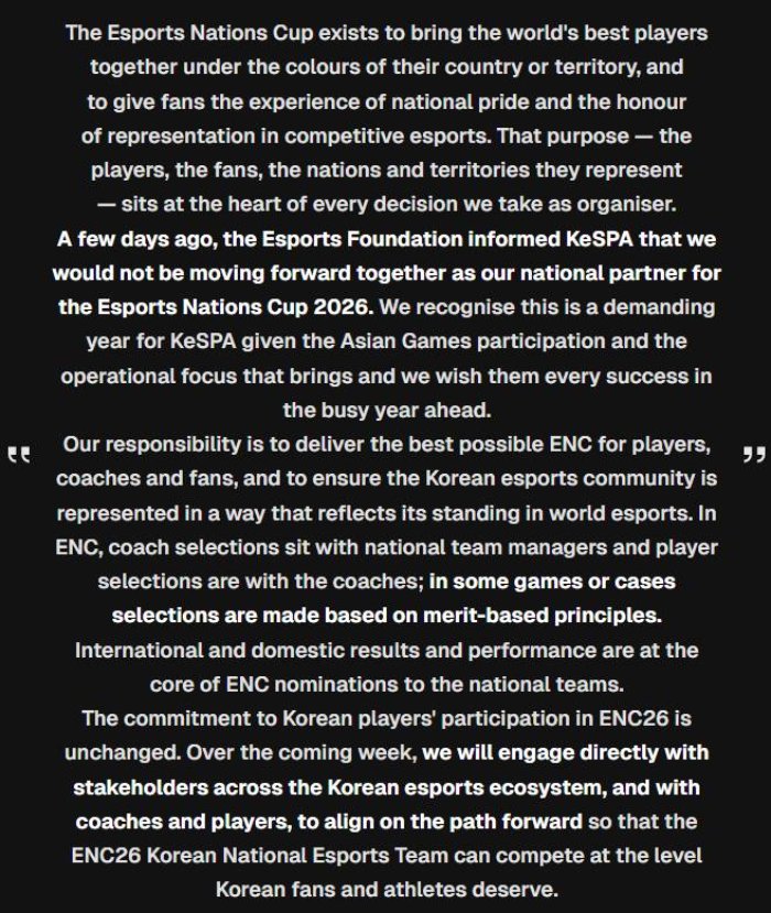 Đáp lại những thông cáo về việc bỏ giải của KeSPA, ENC không hề nao núng khi họ cho biết sẽ liên hệ với chính team chủ quản của các tuyển thủ và HLV tại Hàn để vẫn có đội tuyển quốc gia Hàn thạm dự Esports Nations Cup 2026 :