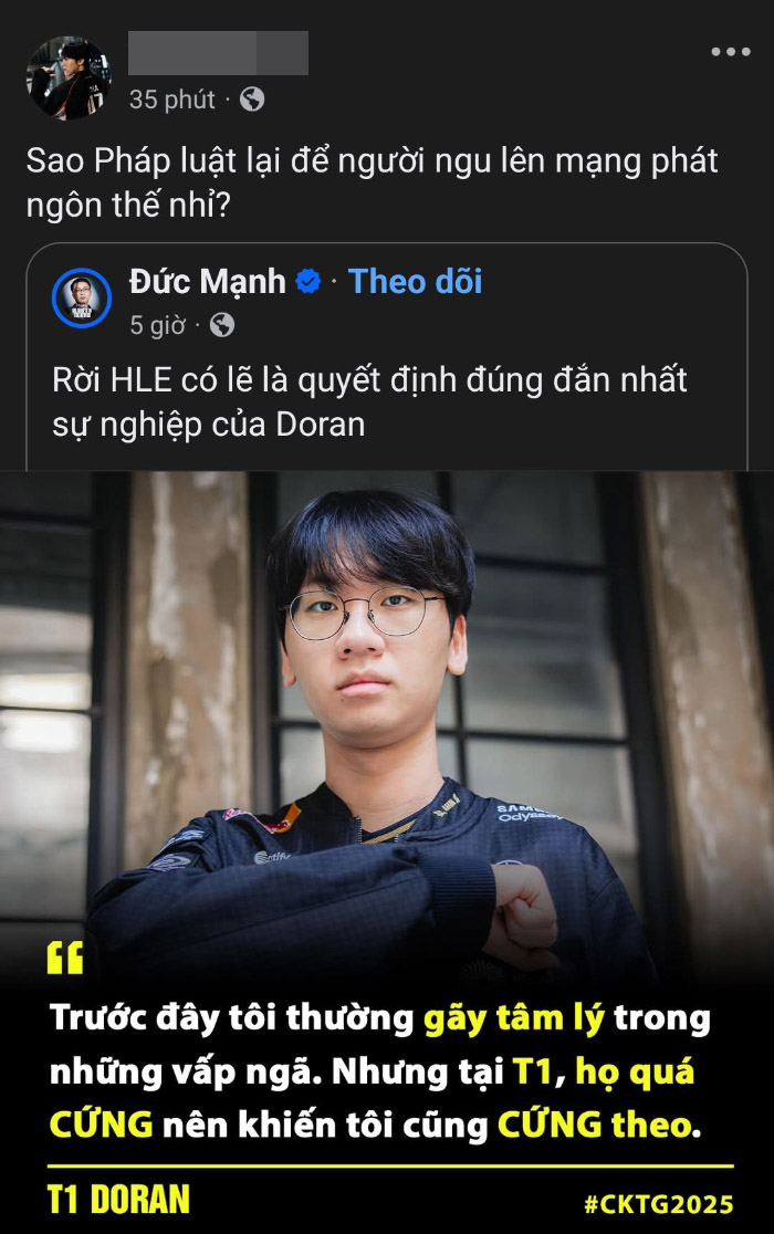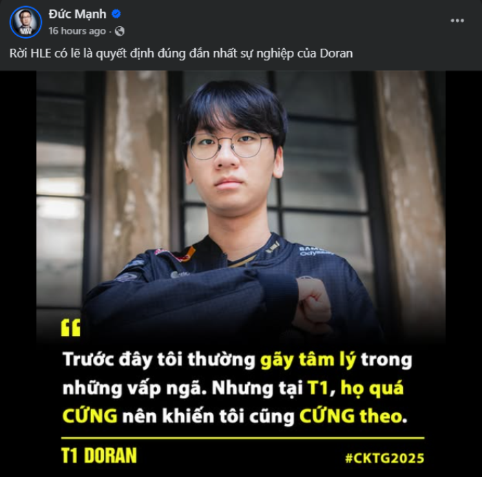 Sau chiến thắng 3-0 gọn gàng của T1, BLV Đức Mạnh đã có một dòng trạng thái cho rằng Doran có quyết định sáng suốt khi rời HLE mùa trước.