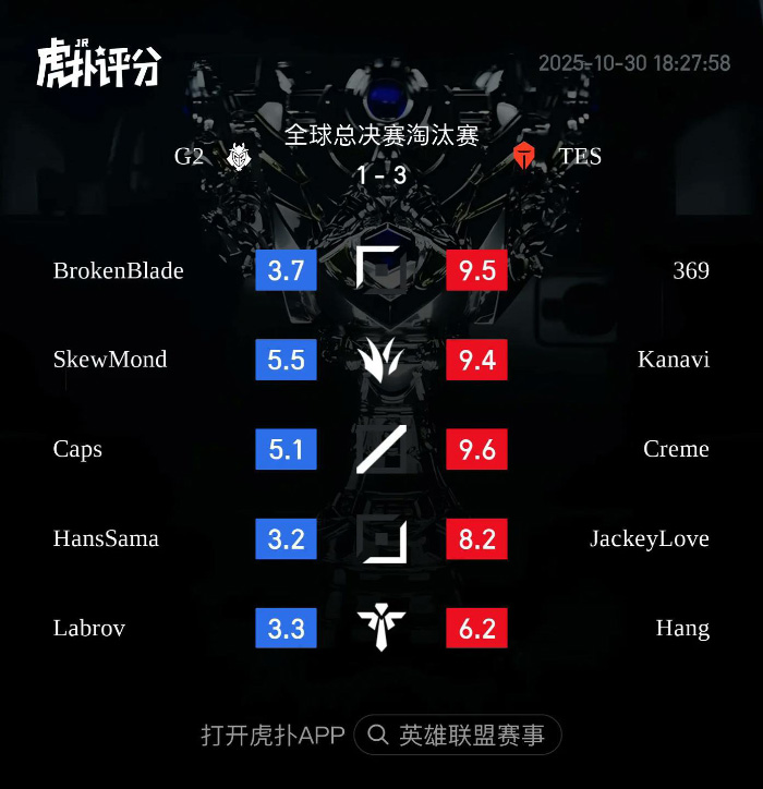 BrokenBlade: Điều đó có lý, nhưng tôi không nghĩ nó đúng với G2. Chúng tôi đã trưởng thành hơn rất nhiều, tự tin hơn trong lối chơi và xử sự, nhưng đó không phải là yếu tố quyết định của ngày hôm nay. Tôi không nghĩ chúng tôi thiếu tự tin, chúng tôi chỉ đưa ra những quyết định kém cỏi, và từ đó trở đi, TES đã chơi tốt hơn. Ở CKTG bạn sẽ bị trừng phạt vì mắc sai lầm, và đó là lẽ thường. Tôi rất tự hào về đội của mình, về sự trưởng thành của chúng tôi. Đây là đội hình mà tôi đã có sự phát triển nhất cả trong lẫn ngoài game trong những năm gần đây. Vì vậy, tôi rất tự hào về cả đội của mình.