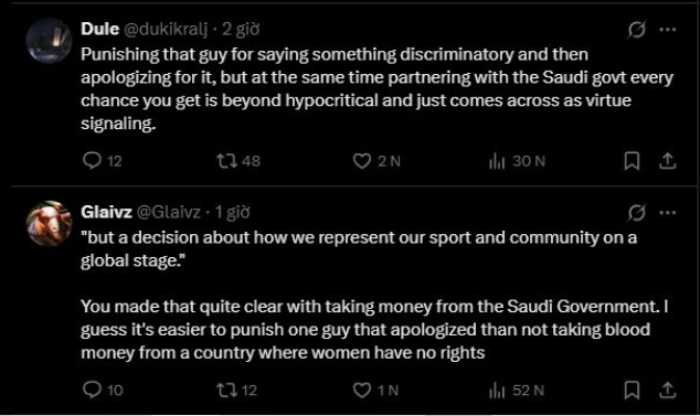 Không ít người trong cộng đồng LMHT phương Tây cũng quay qua chỉ trích Riot không kém, họ cho rằng Riot Games đã nhận tài trợ từ những quốc gia Trung Đông – nơi vốn có quyền cho phụ nữ không cao. Chưa kể đến những drama “quấy rối” phụ nữ trong chính công sở của Riot Games được khui ra khi trước, càng khiến cho những hành động này của họ trở nên buồn cười hơn.