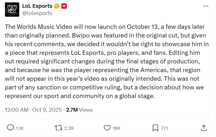 Tóm gọn lại là ngày công chiếu MV CKTG sẽ bị dời sang 13/10 vì Riot quyết định sẽ cắt những hình ảnh liên quan Bwipo ra khỏi video. Cũng vì vậy nên trong MV sẽ không xuất hiện khu vực LTA – một trong những khu vực chủ yếu của LMHT hiện tại.