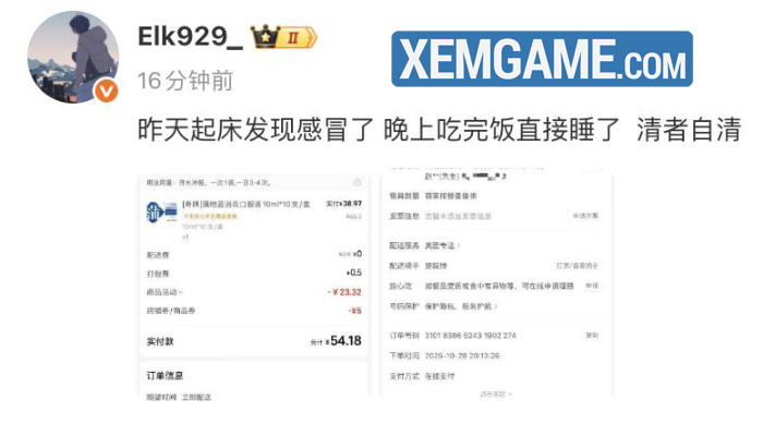 Elk đăng Weibo: “Sáng hôm qua dậy phát hiện bị cảm, buổi tối ăn cơm xong là đi ngủ, thanh giả tự thanh (người thanh bạch không cần giải thích)” – đính kèm hoá đơn mua thuốc lúc 8h tối 28