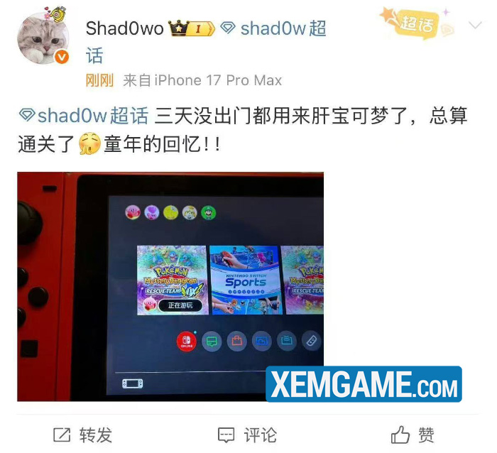 Shad0w đăng Weibo: “3 ngày không ra ngoài toàn dùng để chơi Pokemon, xem như là qua màn rồi. Kí ức tuổi thơ” – đính kèm ảnh chụp Switch.