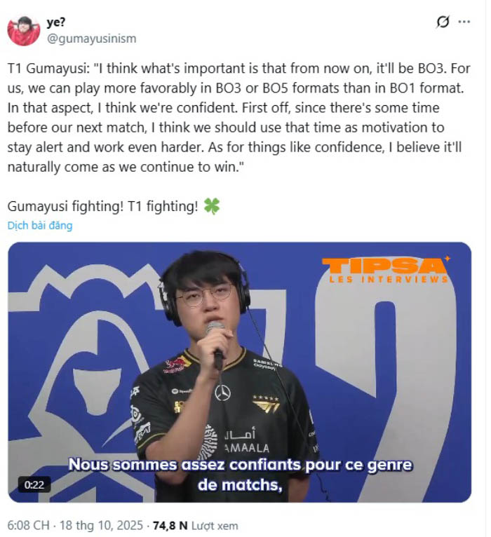 Với thất bại trước Gen.G và CFO, T1 đang vào thế khó khi họ chỉ cần thua thêm BO 3 nữa là sẽ kết thúc hành trình của mình tại CKTG. Sau trận thua trước Gen.G, dù có vẻ tinh thần cả đội và người hâm mộ không tốt lắm nhưng đã Gumayusi thể hiện sự tự tin vào các trận đấu BO 3 sắp tới hơn là BO 1 trước đó :
