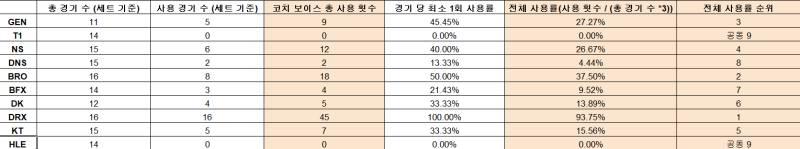 Theo đó DRX sử dụng rất triệt để tính năng Coach Voice, trong khi đó thì T1 và HLE chưa sử dụng lần nào. Các đội khác dù thứ hạng có sự khác biệt nhưng cũng sử dụng tích cực tính năng mới xuất hiện thử nghiệm trong mùa này.
