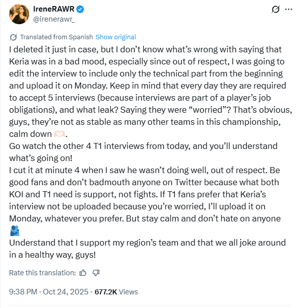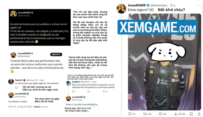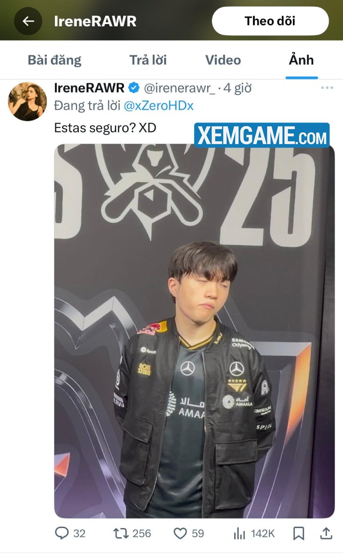 Ấy vậy mà, một drama không đáng có đã nổ ra và có thể ảnh hưởng không tốt đến tinh thần tuyển thủ hỗ trợ của T1 hiện tại. Cụ thể, drama này bắt nguồn từ một KOL người Tây Ban Nha có tên IreneRAWR, cô nàng này đã mời được Keria phỏng vấn trực tiếp sau trận đấu.