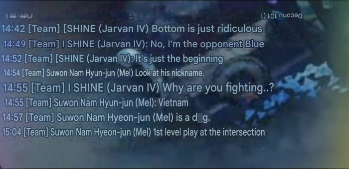 LazyFeel chưa kịp đưa ra nhận xét gì thì Noticed – người chơi đường giữa đang sử dụng Mel bất ngờ đã có lời lẽ khá xúc phạm về quốc tịch của cậu. Đáng chú ý là những bình luận này không chỉ gói gọn trong những mâu thuẫn của trận rank đó nữa mà đã mang tính phân biệt chủng tộc rất nặng – một vấn nạn tồn tại từ lâu tại rank Hàn.