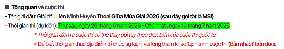 Tuy vậy, nó lại dẫn đến vấn đề lịch trình dày đặc và chắc chắn sẽ ảnh hưởng không nhỏ đến màn trình diễn của các tuyển thủ trong 2026. Cụ thể, theo một bài đăng từ KeSPA (Hiệp Hội Thể Thao Điện Tử Hàn) thì họ đang cân nhắc một số thành phố sẽ đươc tổ chức MSI 2026. Tuy vậy, một chi tiết trong bài đăng khiến nhiều người phải suy nghĩ là ngày dự kiến kết thúc sự kiện sẽ là 12/7/2026 :