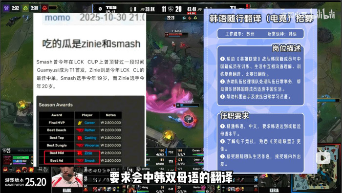 Theo đó, Smash có lẽ là cái tên đáng chú ý nhất khi tuyển thủ này được nhớ đến về biên niên sử drama T1 giai đoạn đầu mùa. Được đôn lên thay Gumayusi khi chính Smash (có lẽ) cũng chưa sẵn sàng về mặt kinh nghiệm và kỹ năng – quyết định khó hiểu này của thượng tầng T1 đã khiến cả 2 tuyển thủ phải chịu khá nhiều những bình luận tiêu cực.
