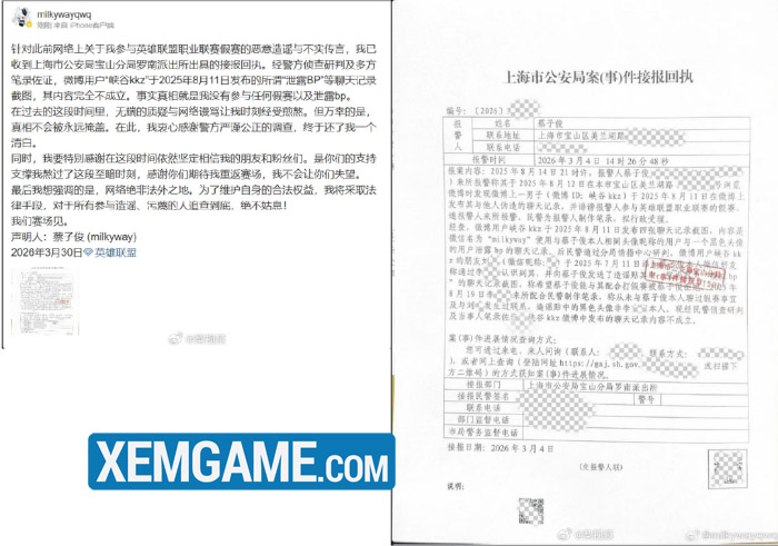 Vào ngày hôm nay, tuyển thủ Milkyway – người từng vướng vào hàng loạt drama khi trước đã đăng tải một bức tâm thư kèm theo văn bản chính thức của Công An Thượng Hải. Những thứ này là bằng chứng chứng tỏ anh vô tội và trong bức tâm thư gửi kèm thì Milkyway cũng yêu cầu cộng đồng mạng cần ngừng ngay những hành vi bạo lực mạng với anh từ khi drama nổ ra.