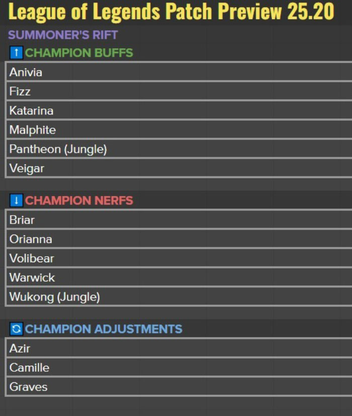 Bản cập nhật này sẽ giảm bớt sức mạnh của một số tướng đi rừng chỉ số, với Briar, Volibear và Warwick bị mất đi một phần sức mạnh, trong khi Pantheon lấy lại sức mạnh sau khi bị giảm quá mức ở bản 25.19. Các điều chỉnh về chỉ số thông thạo mang lại sức mạnh cho các tướng như Malphite, Fizz và Camille, nhằm mục đích tăng sức mạnh và hiệu suất của chúng theo thời gian.