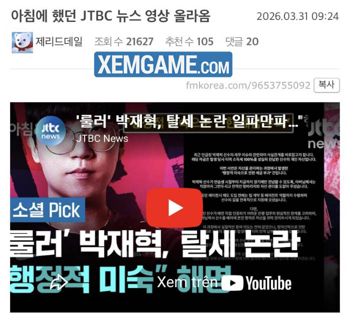 Cộng đồng mạng Hàn Quốc đang bàn tán sôi nỗi về thông tin việc tuyển thủ Ruler có hành vi trốn thuế, bị cơ quan truyền thông chính thống réo tên.