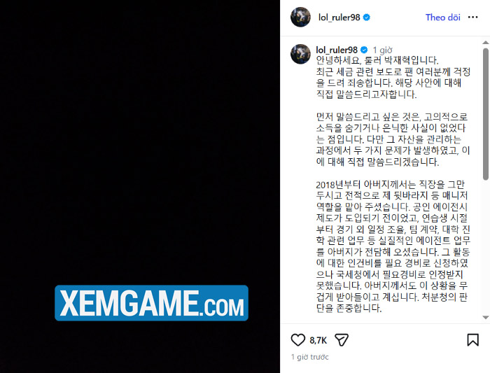 Một chi tiết quan trọng là Ruler đã kháng cáo 3 lần nhưng đều không thành công, chính điều này đã khiến nhiều fan mất đi cái nhìn thiện cảm trước nhà cựu vô địch thế giới 2017. Mới đây GEN Ruler lần đầu lên tiếng giữa lùm xùm dính cáo buộc trốn thuế trên Instagram cá nhân :