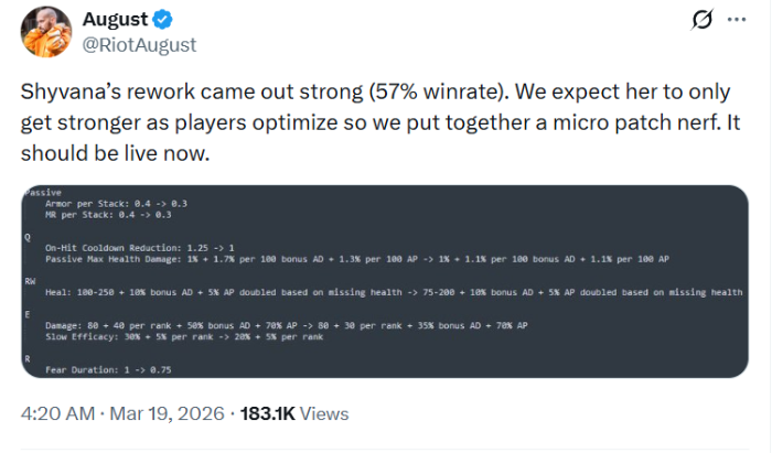 Shyvana làm lại sau khi có tỉ lệ thắng đỉnh nóc chỉ sau một ngày ra mắt, đã khiến Riot Games phải nerf nóng gần như toàn bộ kỹ năng.