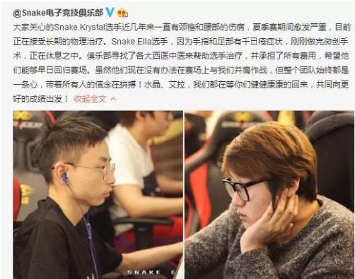 Xạ thủ luôn được các bạn quan tâm, yêu mến – Snake.Krystal – mấy năm gần đây luôn bị chấn thương tại đốt sống cổ và lưng, và đã tái phát chấn thương ngay trước giải LPL mùa hè 2016 vừa qua, hiện tại anh ấy đang trong quá trình vật lý trị liệu dài hạn. Còn về game thủ Snake.Ella, do ngón tay và vùng chân cũng có triệu trứng đau dài ngày, vừa tiến hành phẫu thuật, hiện tại đang trong thời kỳ nghỉ ngơi, hồi phục.
