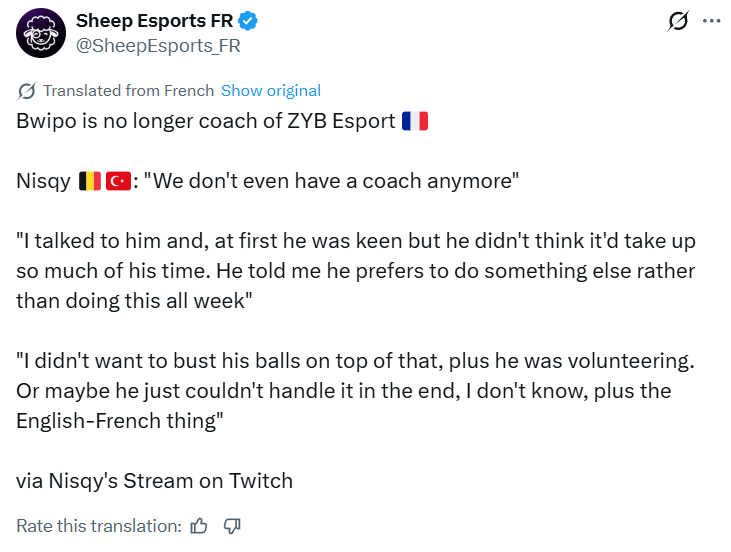 Ấy vậy mà chỉ sau 1 ngày, thì người sáng lập team Nisqy lại thông báo rằng Bwipo sẽ không còn là HLV của ZYB nữa vì anh chàng này cho rằng ” việc huấn luyện sẽ tốn quá nhiều thời gian cá nhân của mình” :