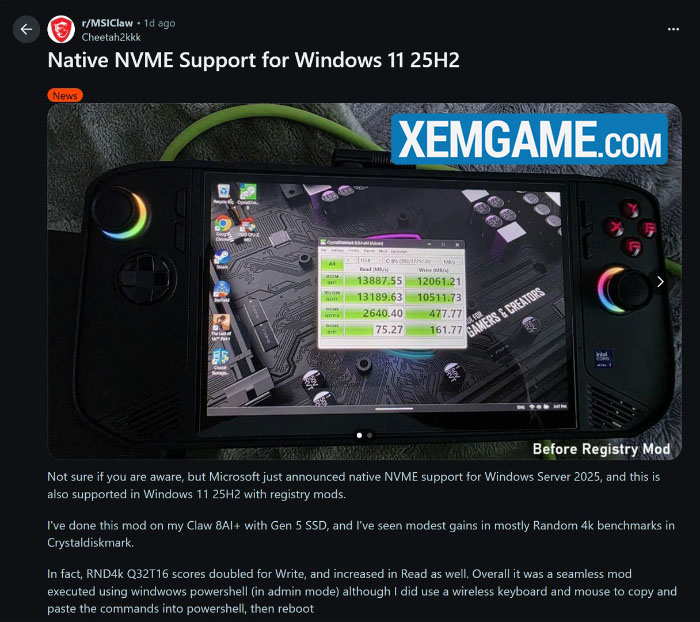 Trong khi đó, một người dùng Reddit có tên ‘Cheetah2kkk’ đã đăng tải một bài kiểm tra khác sử dụng thiết bị chơi game cầm tay MSI Claw 8 AI+ được trang bị ổ SSD Crucial T705 4TB. Các bài kiểm tra của họ một lần nữa cho thấy tốc độ đọc/ghi tuần tự tăng nhẹ nhưng hiệu năng đọc/ghi ngẫu nhiên tăng đáng kể. Trong bài kiểm tra đọc ngẫu nhiên CrystalDiskMark, tốc độ tăng 12% sau khi kích hoạt trình điều khiển, nhưng ấn tượng nhất là tốc độ tăng mạnh 85% trong bài kiểm tra ghi ngẫu nhiên với cấu hình cụ thể này.