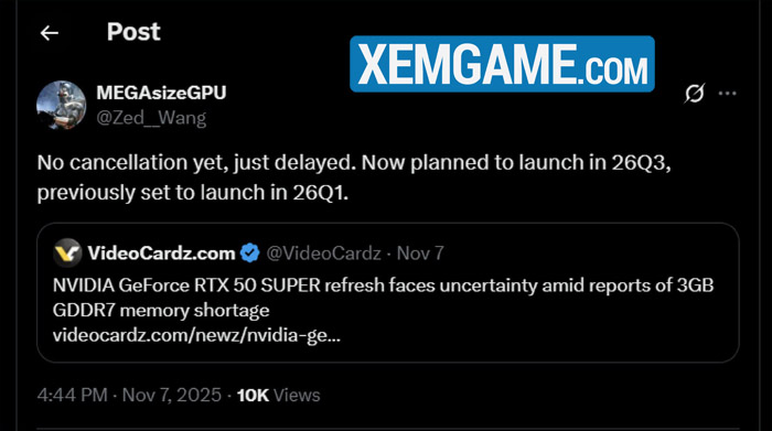 Tin đồn mới về sự chậm trễ đến từ nguồn rò rỉ thông tin công nghệ thường xuyên, MEGAsizeGPU (@Zed_Wang), trên X. Đáp lại các bài viết trích dẫn tin đồn trước đó về việc hủy bỏ hoàn toàn dòng RTX 50 Super, MEGAsizeGPU trả lời rằng: “Vẫn chưa hủy bỏ, chỉ bị trì hoãn. Hiện tại dự kiến ra mắt vào quý 3 năm 2026, trước đó dự kiến ra mắt vào quý 1 năm 2026.”