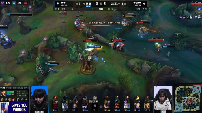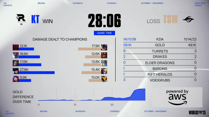 Tuy vậy bản lĩnh macro của LCK vẫn là thứ gì đó quá áp lực, bên cạnh việc về cơ bản là nguồn sát thương chính của bên KT – Xạ Thủ vẫn freeshot từ đầu đến cuối. Cuối cùng, sau vài giao tranh rời rạc, KT đẩy thẳng vào nhà chính của TSW và kết thúc game đấu trong 28 phút.