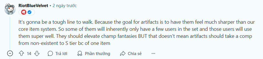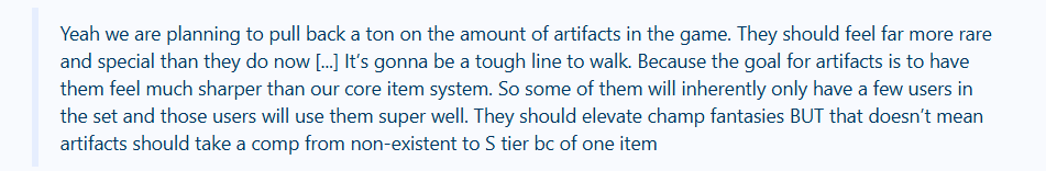 Theo đó, hiện tại trong ĐTCL có đến 33 Tạo Tác nhưng số mạnh thật sự chỉ loanh quanh 5 món đổ lại thôi (ví dụ Đại Bác, Đao Chớp)… và một số đội hình có các Tạo Tác đúng thì thật sự không thể cản phá nỗi. Nên Riot Games muốn giảm bớt số lượng chúng nó là điều đương nhiên, và rất có thể chúng ta sẽ quay lại cái thời mà đồ Tạo Tác vừa hiếm vừa mạnh giống như lần đầu chúng được giới thiệu (đồ của Ornn).