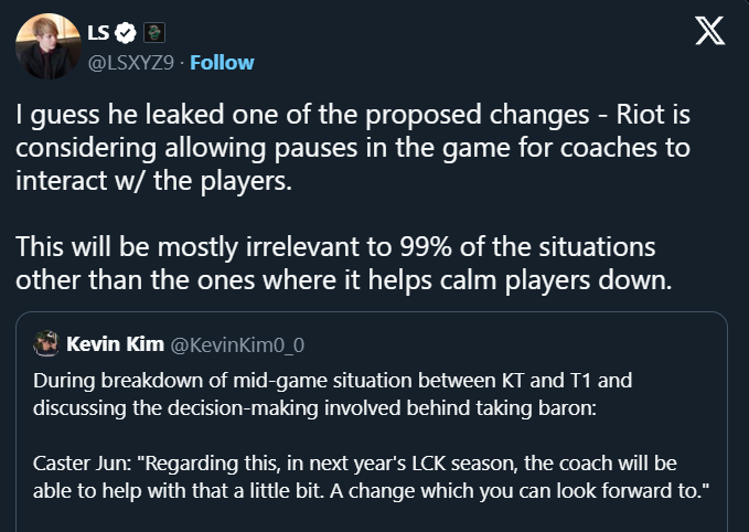 Có một nguồn tin cho rằng Riot Games đang thu thập phản hồi về thay đổi luật tiềm năng cho phép HLV giao tiếp với các tuyển thủ ngay giữa trận đấu trực tiếp.