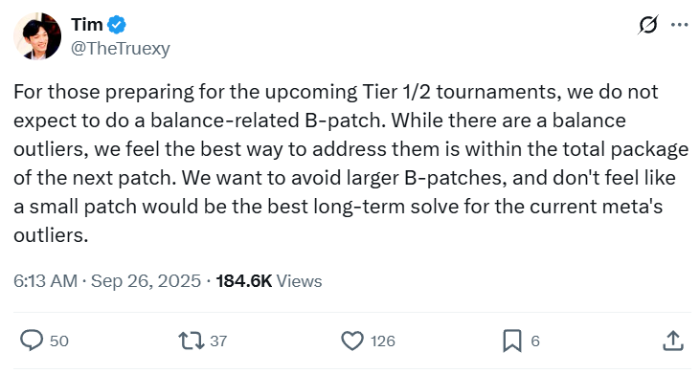 Theo một trong những nhà thiết kế game của ĐTCL thì “Do sắp tới sẽ có những giải đấu Tier 1/2, nên họ sẽ không làm một bản vá b. Dù rằng có một số vấn đề cân bằng nhưng ý kiến của Riot là sẽ giải quyết trong phiên bản lớn kế tiếp (gần 2 tuần nữa). Giờ đây chúng tôi đang tránh những bản vá b, vì cho rằng các bản vá nho nhỏ không phải là cách giải vấn đề lâu dài“.