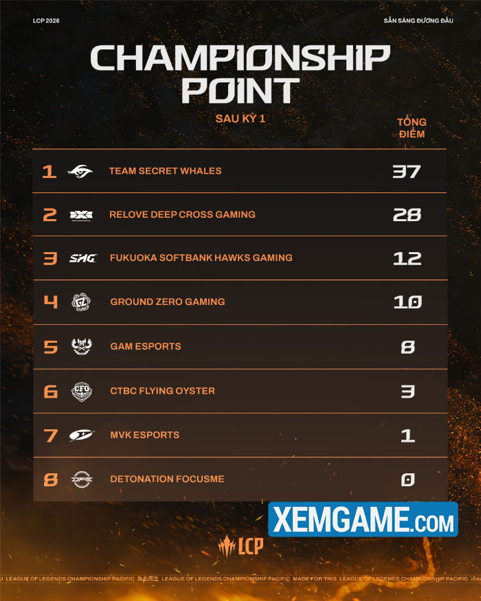 Với việc các đội có thể kiếm đến 55 điểm Championship Point, Giai Đoạn 2 của LCP 2026 sẽ có ý nghĩa vô cùng quan trọng. Đây là thứ hạng của các đội trước khi bước vào kỳ tiếp theo: