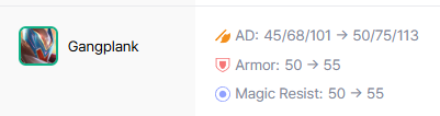 Đáng kể hơn thì Gangplank không được buff kỹ năng nhưng hắn sẽ được ưu ái tăng các chỉ số của mình ví dụ như SMCK từ SMCK 45 ⇒ 50, cho đến buff thêm 5 Giáp/Kháng Phép nữa. Dự kiến thì tuy không thể khiến Gangplank reroll trở lại áp đảo như đầu mùa, nhưng Gangplank giờ đây là một tướng khá khỏe để cầm tạm đồ cho đấu sĩ khác hoặc nếu may mắn từ ra 3 sao thì quá ổn áp để chuỗi thắng đến late game.
