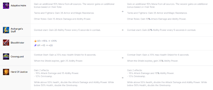 Cuối cùng chúng ta sẽ có những thay đổi với các trang bị và nâng cấp quan trọng. Các trang bị tăng sức mạnh bao gồm Huyết Kiếm (tăng % SMCK/SMPT từ 15 => 20), Nỏ Sét ( tăng Kháng Phép/Máu từ 25/150 => 35/250, đồng thời Sát thương theo năng lượng tiêu hao giảm từ 160% => 150%). Về trang bị Ánh Sáng thì chúng ta có buff cho Áo Choàng Bóng Tối Ánh Sáng (SMCK/SMPT tăng từ 20 => 30), Huyết Kiếm Ánh Sáng cũng tăng SMCK/SMPT từ 40 => 45. Nanh Nashor Ánh Sáng có tốc độ đánh giảm 20% => 10% và Nỏ Sét Ánh Sáng cũng tăng SMPT/Kháng phép/Máu từ 15/40/200 => 30/70/500 khá khỏe.