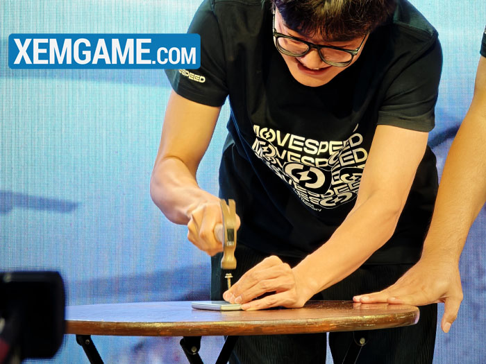 Tâm điểm của buổi lễ khiến toàn bộ khán phòng ấn tượng mạnh mẽ chính là màn trình diễn thực tế (live demo) kiểm chứng chất lượng an toàn của sản phẩm. Ngay trên sân khấu, chuyên gia kỹ thuật đến từ Movespeed đã thực hiện thử nghiệm đâm xuyên sạc dự phòng bằng vật kim loại nhọn. Kết quả cho thấy, dù chịu tác động vật lý phá hủy nghiêm trọng, viên pin Movespeed vẫn giữ trạng thái ổn định, không hề xảy ra hiện tượng cháy nổ hay bốc khói.