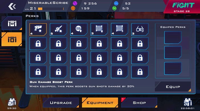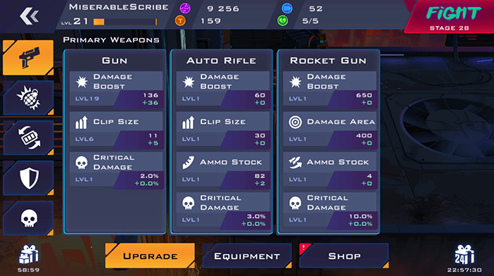 Trong quá trình việc qua các màn chơi của game, độ thử thách sẽ tăng theo cấp độ. Và vì có hàng trăm trong số đó, bạn sẽ dần dần cảm thấy khó khăn. Để bù đắp điều này, sau khi hoàn thành mỗi giai đoạn, bạn sẽ được thưởng nhiều tài nguyên khác nhau mà bạn có thể sử dụng để nâng cấp vũ khí và kỹ năng đặc biệt của mình.