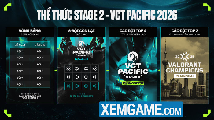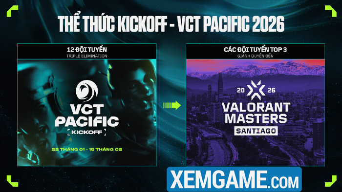 Giải đấu VCT Pacific Kickoff mở màn cho mùa giải mới 2026 sẽ diễn ra từ ngày 22.01 – 15.02. Lần đầu tiên, Riot Games sẽ tổ chức Kickoff theo thể thức đấu loại 3 nhánh (Triple Elimination), các đội sẽ có 3 cơ hội trước khi bị loại.